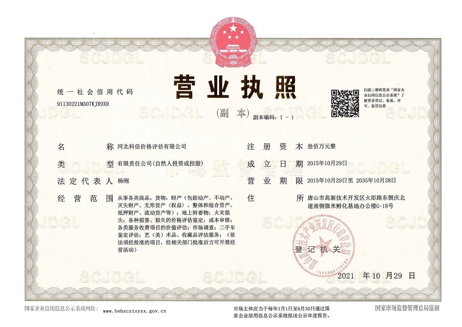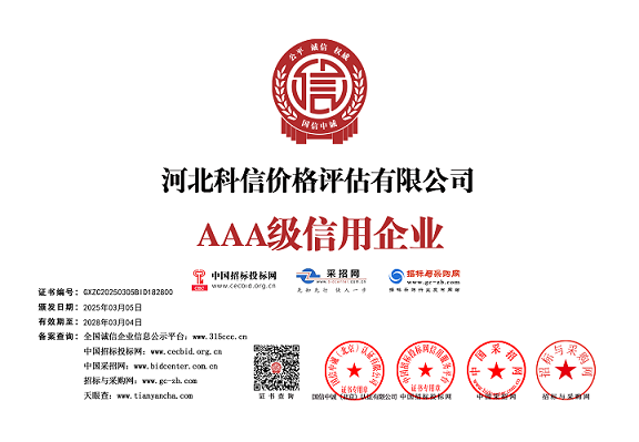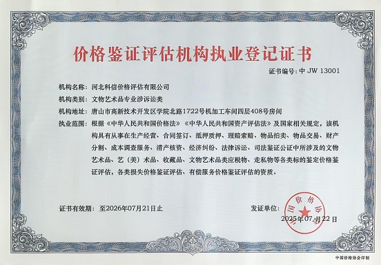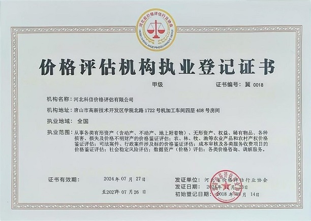 河北科信價(jià)格評估有限公司為"AAA"級信用企業(yè),具有商務(wù)部、文化部備案,頒發(fā)相關(guān)鑒定與專業(yè)評估資質(zhì),由河北省價(jià)格評估行業(yè)協(xié)會頒發(fā)的“甲級”《價(jià)格評估機(jī)構(gòu)執(zhí)業(yè)登記證書》。公司是河北省價(jià)格評估行業(yè)協(xié)會常務(wù)理事單位,河北省科技型中小企業(yè),河北省政府中介超市入冊鑒定評估機(jī)構(gòu)、唐山市政府中介超市入冊的鑒定評估機(jī)構(gòu)、唐山仲裁委員會入冊鑒定評估機(jī)構(gòu)。依法在唐山工商行政管理部門注冊登記的獨(dú)立第三方評估機(jī)構(gòu)。公司成立于2015年,注冊資金300萬元人民幣,公司擁有多名價(jià)格鑒證師、價(jià)格評估專業(yè)人員、國家高級、中級機(jī)動車鑒定評估師、中級涉案財(cái)物評估師、汽車估損師、保險(xiǎn)公估師、高級林業(yè)工程師等,為您提供專業(yè)優(yōu)質(zhì)的服務(wù),公司嚴(yán)格按照程序組織實(shí)施鑒定評估以及合法的市場調(diào)查業(yè)務(wù),所出具的價(jià)格評估報(bào)告書、意見書具有法律效力并為國家認(rèn)可。公司自成立以來共接受河北省交警系統(tǒng)、法院系統(tǒng)、檢察院系統(tǒng)、交通局系統(tǒng)、財(cái)政系統(tǒng)、銀行系統(tǒng)以及社會各界人士的各類委托3000余件,受到一致好評。在執(zhí)業(yè)過程中,我們將依照相關(guān)的法律、法規(guī),嚴(yán)格遵循客觀、獨(dú)立、公正、公平、科學(xué)性的原則;竭誠為您提供專業(yè)、權(quán)威的價(jià)格評估服務(wù)和信息咨詢服務(wù);為您提供專業(yè)、快捷的優(yōu)質(zhì)服務(wù)。